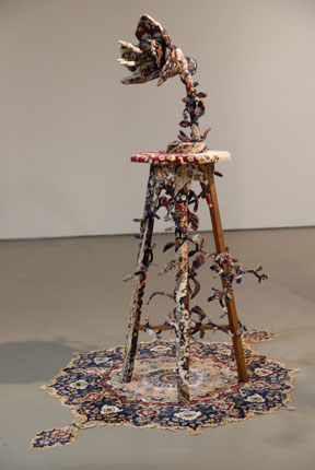 A artista constrói seus animais a partir do zero, usando arame de galinha e fita adesiva e então os cobre com tapetes persas idênticos ou quase idênticos para criar a ilusão de que a criatura é fundida com o tapete pendurado.