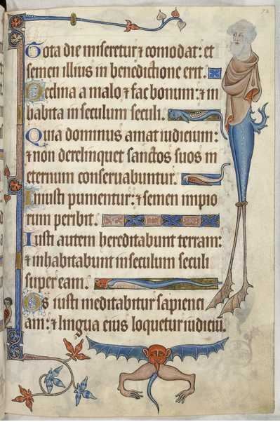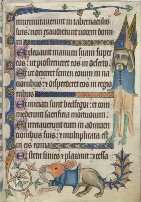 Voltando ao trabalho do carinha aqui. Pelo que eu entendi, existe um documento histórico chamado Luttrell Psalter, um manuscrito do século 14 que, dentre outras coisas, fala de algumas criaturas mitológicas. Esse livro (texto) é famoso por trazer iluminuras (desenhos) de criaturas mitológicas e híbridas nas margens de suas páginas.