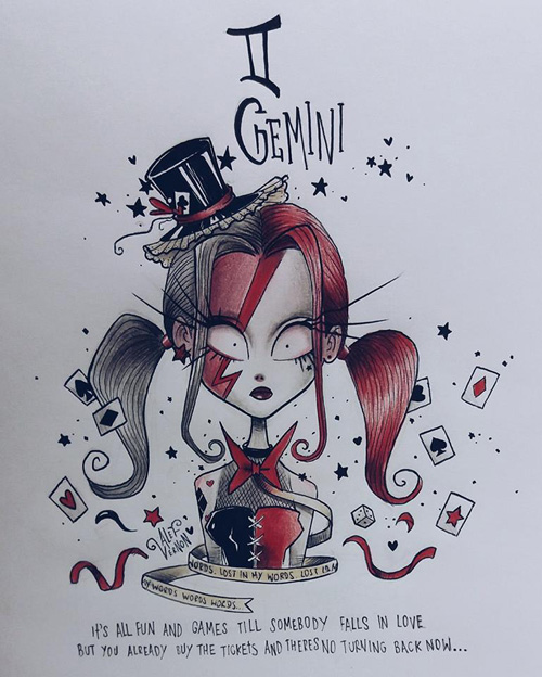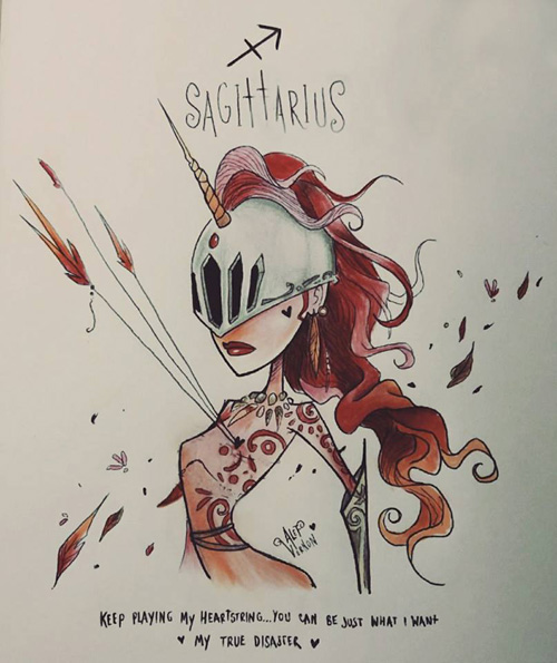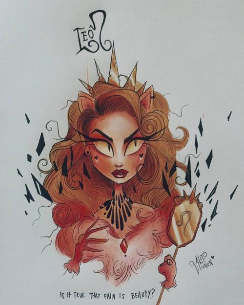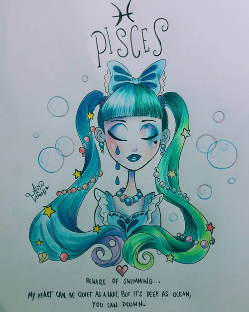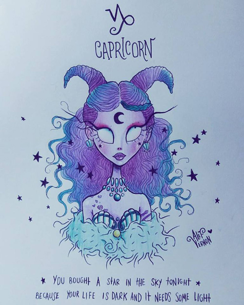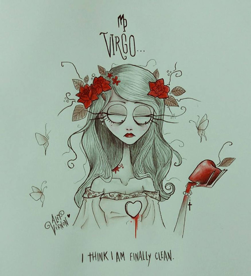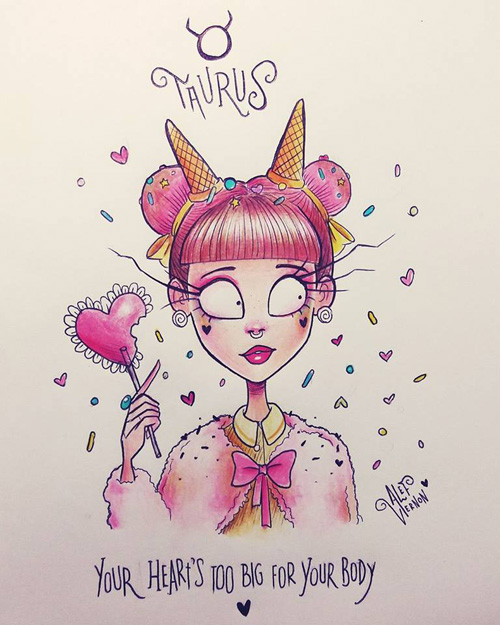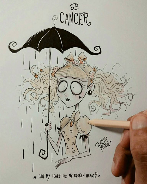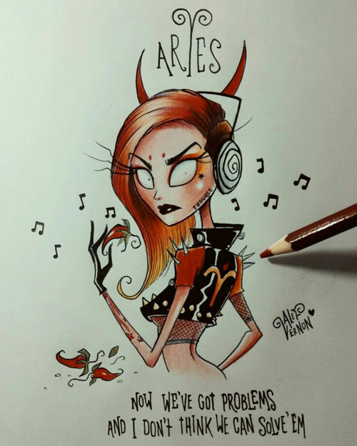 O ilustrador Alef Vernon fez uma série de ilustrações sobre os signos do zodíaco (ou do horóscopo, sei lá) em um estilo meio sinistro-colorido-louco-de-droga naquele estilo de Tim Burton. Na verdade eu nem acho que seja tão “Burtoniano” assim, mas é o que o site de referência diz… e como eu não entendo nada de arte mesmo, ta tudo certo.