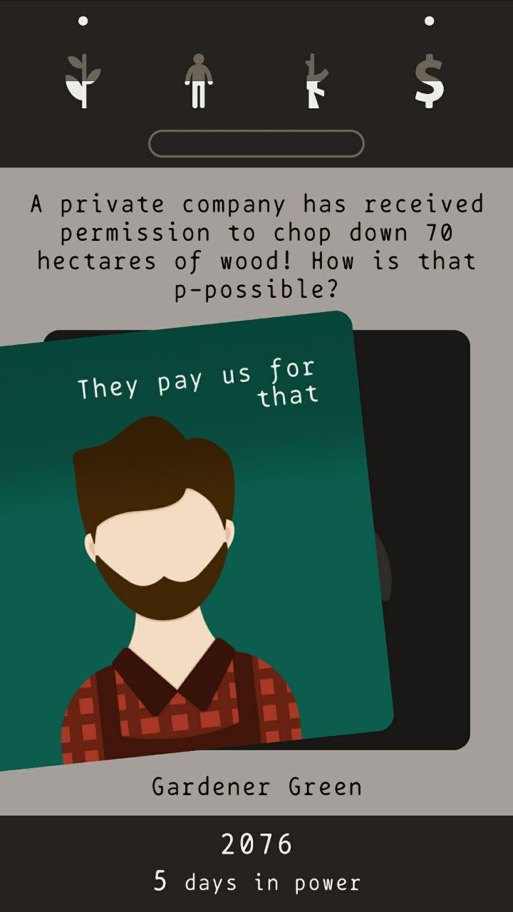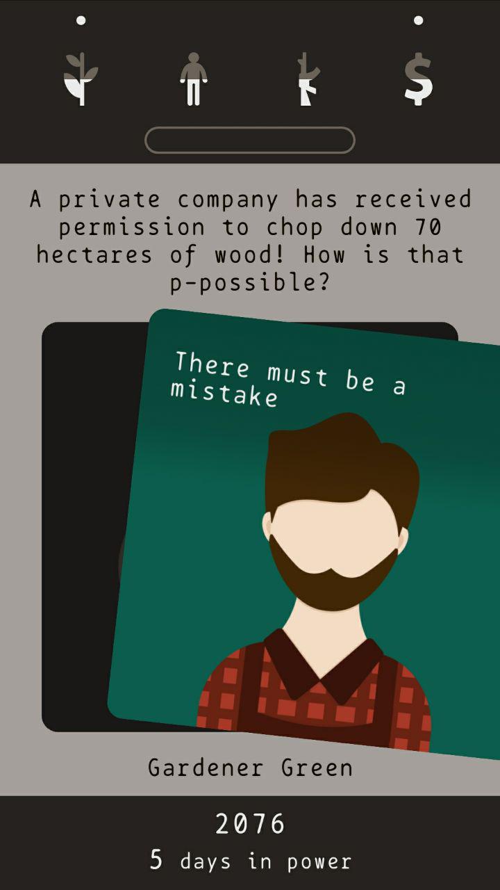 A mecânica do jogo é a seguinte: um determinado personagem aparece na tela com uma pequena fala acima dele e, a partir de um deslizar para esquerda ou direita, você escolhe a decisão que mais lhe parecer “correta” (lembrando que tecnicamente não existe certo ou errado no jogo). Cada decisão aumenta ou diminui uma determinada quantidade de recursos que você dispõe: “meio ambiente” (planta), “recursos humanos” (pessoa), “forças de segurança” (arma) e “dinheiro” (cifrão).
